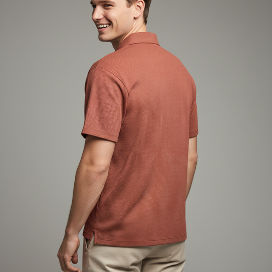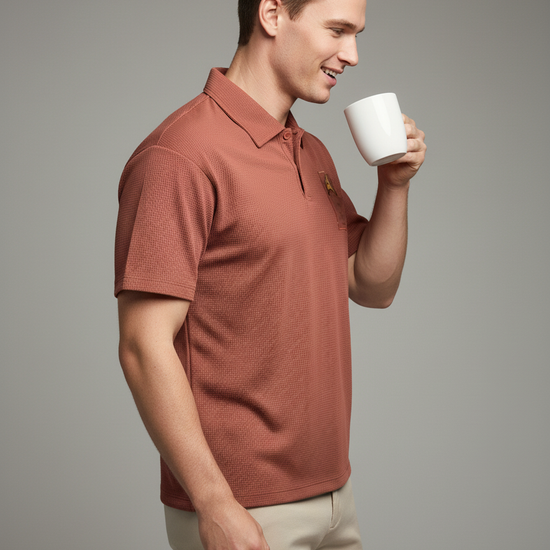 Step into everyday sophistication with the Rust Drop Shoulder Polo T-shirt, the perfect blend of relaxed fit and premium craftsmanship. Crafted from a 95% cotton, 5% elastane mix, this polo tee delivers cloud-soft comfort with a touch of stretch for all-day ease. The rust hue adds warmth and style, making it a standout piece in any smart casual wardrobe.