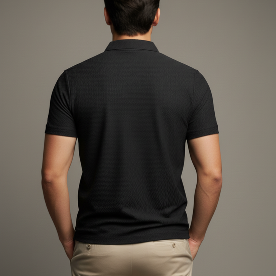 Elevate your everyday look with the Black Textured Seamless Polo T-shirt, a versatile essential that blends premium comfort with modern style. Made from a smooth 95% cotton, 5% elastane blend, this black polo delivers a luxuriously soft hand and a secure, flexible 2-way stretch that moves with you all day.