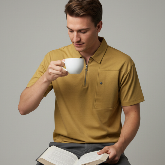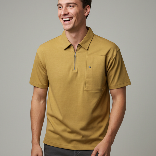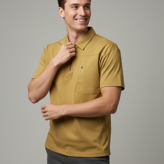 Meet the Mustard Zipper Polo T-shirt, a refined blend of comfort, style, and performance designed to elevate your everyday look. Crafted in a warm mustard shade, this polo-inspired tee features a sleek zipper detail for a modern edge and versatile wear from casual to smart casual ensembles.