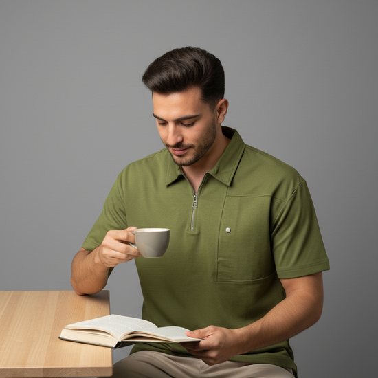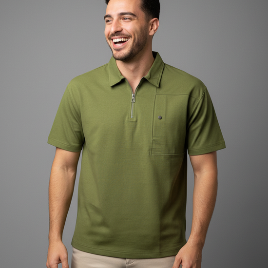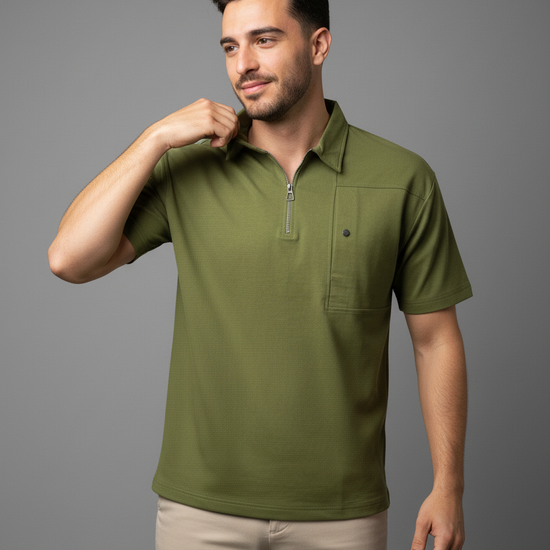 Elevate your everyday with the Olive Green Half-Zip Polo T-shirt. A multipurpose smart casual piece designed to make you stand apart, whether you’re in the office, on a weekend outing, or traveling light.