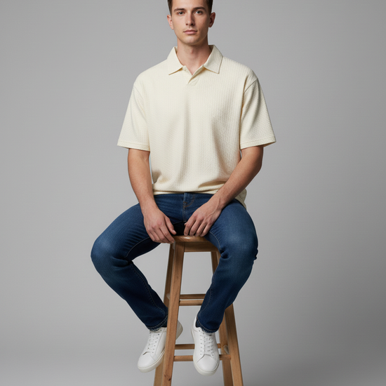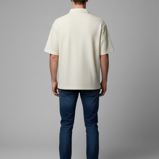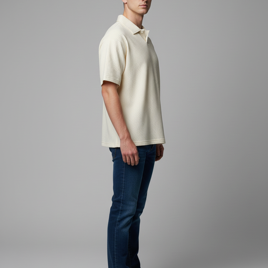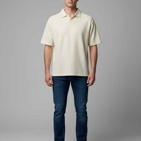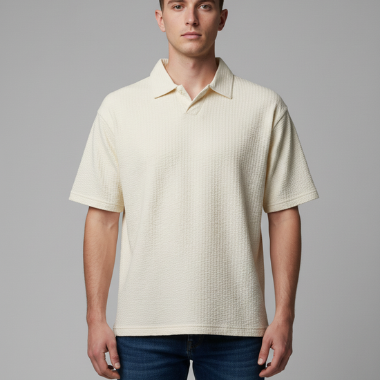 Cream textured Ivory Polo T-shirt blends classic polo design with modern performance fabric for everyday elegance and all-day comfort. This versatile polo tee takes you from office smart casual to weekend leisure with ease.